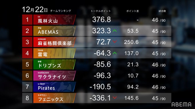 2020-12-22 / 最終更新日時 : 2023-05-02 naoya game 試合結果 2020/12/22 目次第1試合第2試合関連記事 Mリーグ2020 レギュラーシーズン 46日目 実況:松嶋桃 解説:鈴木たろう 第1試合 【#Mリーグ2020 実況】第1試合が終了しました。ABEMAS・日向がオーラスでの大逆転を決めて個人3勝目‼️1位 日向(ABEMAS)+55.52位 萩原(雷電)+13.13位 魚谷(フェニックス)▲10.84位 前原(麻雀格闘倶楽部)▲57.8視聴はこちら▶https://t.co/zymonVdb4Y pic.twitter.com/lBOmypexL5— Mリーグ(プロ麻雀リーグ)実況 (@m_league_jikkyo) December 22, 2020 第2試合 【#Mリーグ2020 実況】第2試合が終了しました。フェニックス・茅森が東2の親番で大きくリードを広げて個人5勝目‼️1位 茅森(フェニックス)+74.22位 松本(ABEMAS)+14.63位 藤崎(麻雀格闘倶楽部)▲17.94位 瀬戸熊(雷電)▲70.9視聴はこちら▶https://t.co/zymonVdb4Y pic.twitter.com/NTk10ySVeL— Mリーグ(プロ麻雀リーグ)実況 (@m_league_jikkyo) December 22, 2020 関連記事 【12/22 Mリーグ2020 結果】第一試合は日向がオーラスの跳満ツモで大逆転トップ!第二試合はフェニックス・茅森が怒涛の親番ラッシュで一気に試合を決める! 第1試合 ABEMA TV 試合動画第2試合 ABEMA TV 試合動画第1試合「日向藍子、オーラス目が覚める大逆転!! 萩原聖人の悲願を打ち砕き、3勝目獲得!!」キンマweb第2試合「茅森早香、バイマンに小三元と、怒濤の親番攻勢で5勝目獲得!! フェニックスが蘇るか!?」キンマwebTwitter Mリーグ(プロ麻雀リーグ)実況Twitter Mリーグ/プロ麻雀リーグ FacebookXBlueskyHatenaCopy