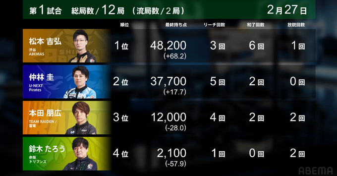 - キンマweb 第1試合「松本吉弘、東場で先行し仲林の追撃をかわして逃げ切りトップ!! ABEM…」