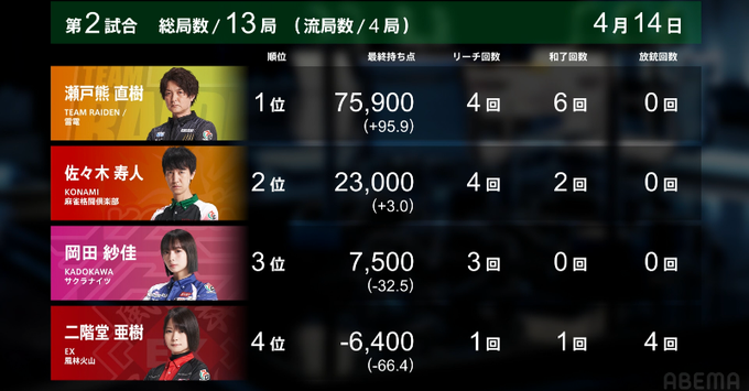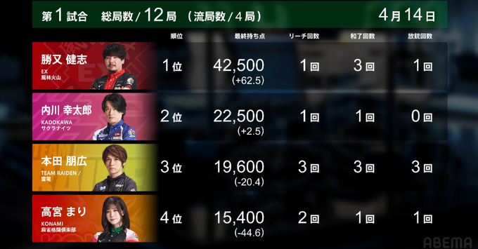 - キンマweb 第1試合「勝又健志、初登板初トップ!! 風林火山、首位浮上!!【Mリーグ2022-…」