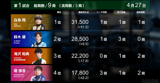 - キンマweb 第1試合「白鳥翔、しびれる接戦を差し切り!! 3勝目獲得で、ABEMAS 4位の座を…」
